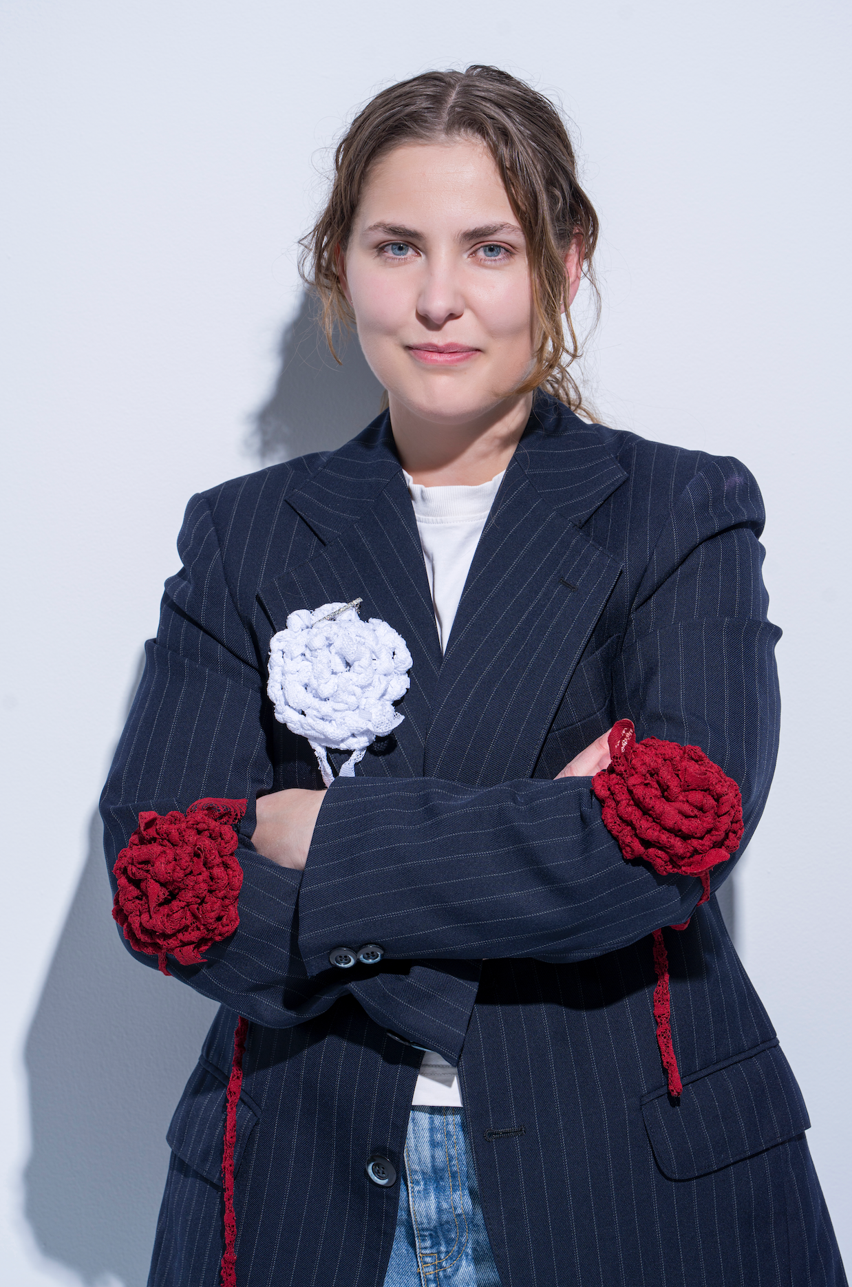 Blómin eru unnin uppúr vintage blúnduefni sem er klippt niður þannig að ekkert verður afgangs. Strimlarnir eru svo teygðir varlega til og úr þeim gerðir garn. Því næst er heklað úr garninu og búin til blóm. Endarnir fá svo að standa eftir eins og stilkar.